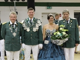 Um die Nachfolge von Kaiser Hans-Michael Zensen bewarben sich beim Schützenfest 2014 drei Schützen: Kevin Becker, Frank Preuß und Bernadette Zensen, die mit dem 114. Schuss den Königsvogel von der Stange schoss. Ihr König ist Thomas Kranz, die Krönung wurde von Brudermeister Hans-Peter Schulze (l.) und seinem Stellvertreter Hans-Jürgen Lißner (r.) vorgenommen.